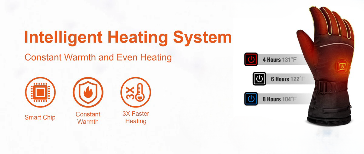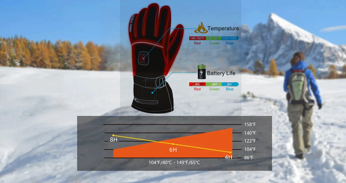 40-65°C precise temperature control and power display switch button control, intelligent preheating in the first 3-5 minutes. The heating temperature range of the gloves is 40°C-65°C, and the use time is 4-8 hours.